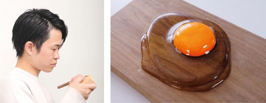 浜松市在住。本物そっくりなお菓子から透明な生卵まで全て木彫りで作ってしまう木彫りアーティスト。コロナ禍で始めた趣味の木彫りがたちまちTVやSNSで話題となり、公務員を退職してプロのアーティストに。