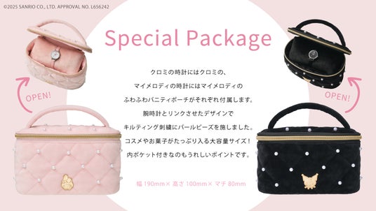 時計ボックスの代わりとしてクロミの時計にはクロミの、マイメロディの時計にはマイメロディのふわふわバニティポーチがそれぞれ付属します。