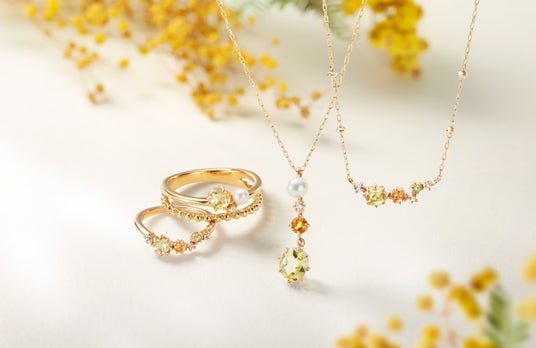 メインとなるのは、ミモザの優しい黄色を思わせるレモンクォーツや、春らしいパールを組み合わせたシリーズ。また、ミモザの花と葉をイメージしたグラデーションカラーのカラーストーンや、花のふんわりとした質感を石寄せで表現したデザインも登場します。さらに、ミモザをモチーフにしたシルバージュエリーは、2連ネックレスやフープピアスなど、軽やかに揺れるデザインが魅力です。