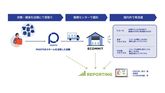 「PASSTO(パスト)」のスキームを活用し、回収した不要品は、ECOMMITにより国内外でリユース品として再流通されるほか、リユースが難しいものに関してはリサイクルパートナーを通じて再資源化されます。