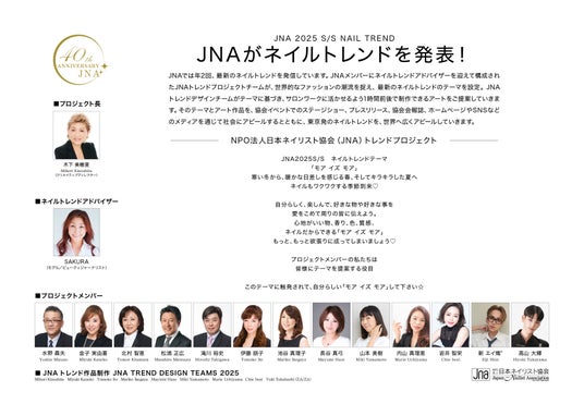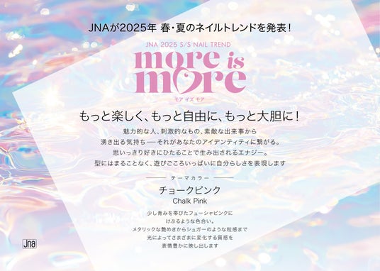 NPO法人日本ネイリスト協会(略称:JNA、所在地:東京都千代田区、理事長:仲宗根幸子)は、2025年春夏のネイルトレンドのテーマを「モア イズ モア」とし、このテーマを表現する作品を発表します。