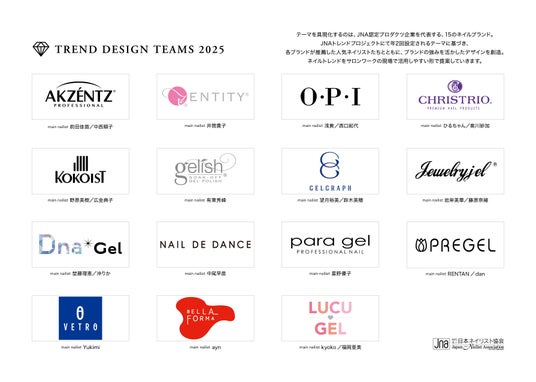 このネイルトレンドは、世界的なファッションの潮流なども踏まえ、「JNA ネイルトレンドプロジェクト(プロジェクト長 木下美穂里)」 が年2回設定し、発表しています。日本ネイリスト協会メンバーに、ネイルトレンドアドバイザーとしてモデル/ビューティジャーナリストSAKURAさんを迎え、熟考し作り上げたテーマを元に、JNAトレンドデザインチーム(JNA認定プロダクツ企業から選抜されたネイルブランドと一流ネイリスト)が、ネイルサロンのお客様に提供するアイディアとして、ネイル作品制作を担当しています。