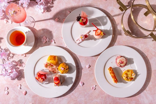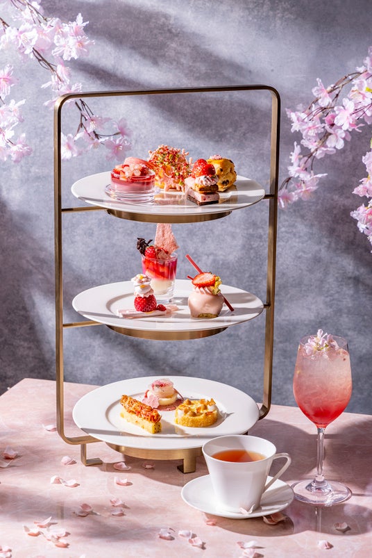 桜といちごをテーマにした新アフタヌーンティーは、水ようかんやおもちを使った和スイーツ、ミルフィーユ、パブロバ、ムースの洋スイーツと和洋折衷のラインナップでそれぞれに個性の違う味わいをお愉しみいただけます。繊細ながら華やかさも兼ね備えた、やさしい春の色合い、香り、風味が折り重なり、エレガントに仕立てたスイーツとセイボリーをご堪能いただけます。