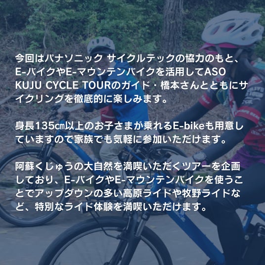 ASO KUJU CYCLE TOURでは、パナソニックのE-bikeやE-マウンテンバイクを活用し、阿蘇くじゅうの大自然を満喫するライドツアーを開催しています。電動アシスト機能を活用し、アップダウンのある地形でも快適に楽しめるのが魅力です。今回は、パナソニック サイクルテック株式会社の協力のもと、家族で参加可能なE-bikeツアーを実施します。身長135cm以上のお子さま向けE-bikeも用意し、親子での参加が可能です。