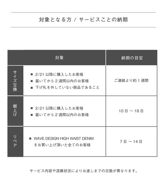 服はただの消耗品ではなく、私たちと共に歩んでいくパートナーだからこそ、デニムを永く愛用いただくためのサイズ交換や裾上げのほか、ボタンやポケットなどの付属品の補強ができるサービスを提供します。