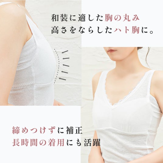 汗脇パッド付きで、大切なお召し物を汗や皮脂から守ります。身体にふわりとフィットするよう背面を引き寄せ、襟ぐりは衣紋(えもん)を抜いてもインナーがチラ見えしない深さにこだわり、腰ひも部分には包帯生地が当たるように細かく調整されています。静電気をふせぐ裾よけ付きのワンピース型インナーなので、着物や浴衣を着た時の足さばきも快適です。