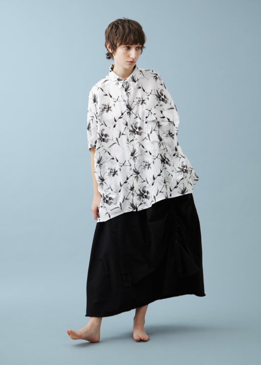 (TOPS) Asymme Side Long Shirt Printed Khadi ¥42,900 (BOTTOMS) Rhythm Drawstring Skirt 56dt Khadi ¥31,900