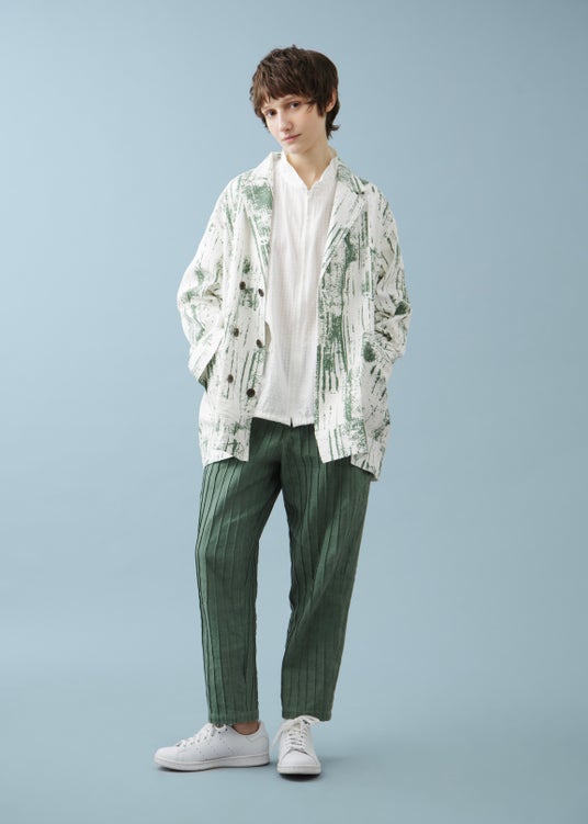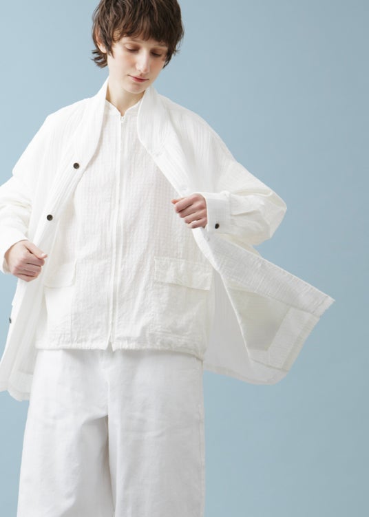 (TOPS) Kaname Oversized Jacket Printed Linen Khadi ¥55,000 (INNER) Play Safari Blouson Small Chatai ¥35,200 (BOTTOMS) Kaname Pintuck Pants Linen Khadi ¥44,000