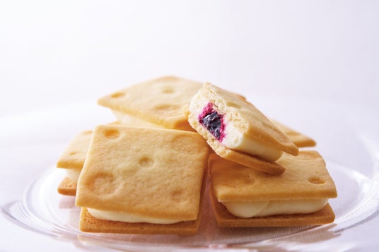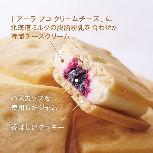 北海道ミルクの脱脂粉乳と、ミルク本来の豊かなコクを楽しめる「アーラ ブコ クリームチーズ」を合わせ、北海道産のハスカップのジャムを包み、薄焼きクッキーでサンドした「ハイチーズクリームサンド」は進化系バターサンドとして誕生しました。「アーラ ブコ クリームチーズ」は、コクがありながらも素材のおいしさを引き立てるクリームチーズです。