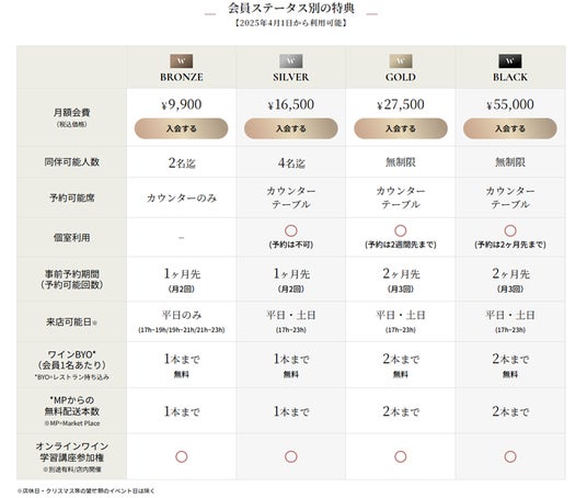 「Fine Wine Collection」は、ステータスごとにサービス内容の異なる月額会員制サービスです。BRONZE、SILVER、GOLD、BLACKと4段階のステータスがございます。ご希望の使用頻度や楽しみ方次第でお好きな会員ステータスをご選択いただけます。