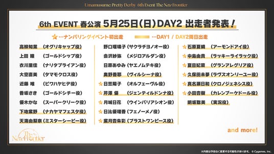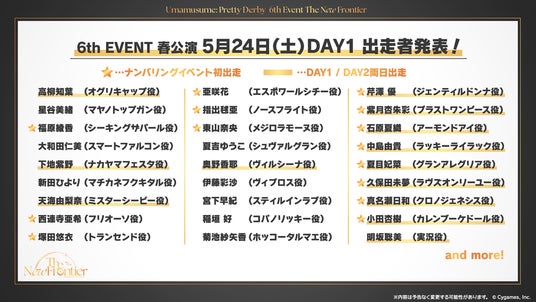 ゲームの企画・開発・運営事業を展開する株式会社Cygames(本社:東京都渋谷区、代表取締役社長:渡邊耕一)は、弊社が展開するクロスメディアコンテンツ『ウマ娘 プリティーダービー(以下、ウマ娘)』について、「ウマ娘 プリティーダービー 6th EVENT The New Frontier」春公演・秋公演をさいたまスーパーアリーナにて開催します。本日2月22日(土)に6th EVENTの特設サイトをオープンし、さまざまな情報を公開しました。