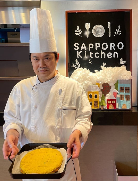オムレツは、北海道産の牛乳とバターで風味を出し、刻んだズッキーニ、パプリカ、人参、玉ねぎを加えることで彩り豊かに仕上げました。均一に火入れできるようにオーブンの温度と湿度を何度もテストしながら完成した大きな丸いオムレツは、1台を50切れにして提供しています。開始直後から、大変好評で、毎日、卵約100個分のオムレツをお召し上がりいただいております。