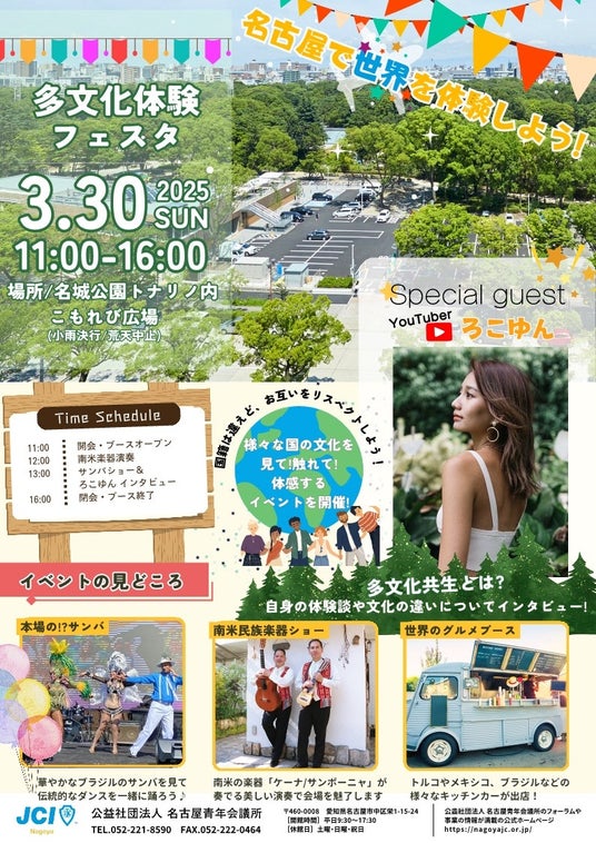公益社団法人名古屋青年会議所2025年度(第75年度)多様性都市NAGOYA構築委員会の主催にて、2025年3月30日(日)11:00~16:00、名城公園トナリノ・こもれび広場を会場に、「多文化共生」をテーマにした、3月フォーラム「多様性都市NAGOYAを構築する例会~多文化フェスタ~」を開催します。