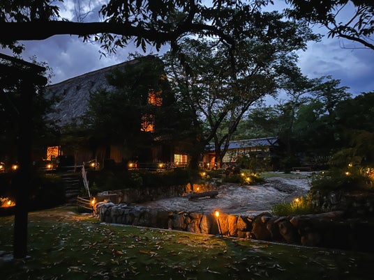 ウッドデザインパーク瀬戸は、合掌造りの建築物がシンボルの自然に囲まれたアウトドア施設で、グランピングやBBQ、自然薯を使用した食事などが楽しめるスポットです。
