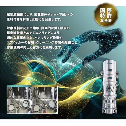 AI超音波技術(開発中)【国際特許取得済み】超音波技術により、装置缶体やホッパ内面への原料付着を抑制、流動化を促進。