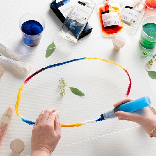 「染-marche」は、液体染料を専用ペンに入れ、手軽に「糸染め」が楽しめる画期的なブランド。水で薄めるので火や温度管理が不要、好きな色や濃度でオリジナルの段染め糸が簡単に作れます。専用の良質な綿糸を使用し、針通りも抜群。スターターキットには基本の染料3色が入り、「色の三原色」の学習にも最適。自分好みのグラデーション糸が作れる、新感覚のハンドメイド体験を提供します。