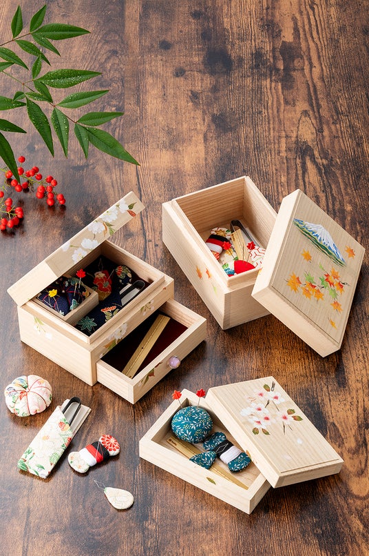 日本の伝統工芸と現代の実用性が融合した「お針箱」。広島・安芸太田町の熟練職人が作る手縫針、播州の握り鋏、京の桐箱など、こだわりの道具を厳選。針やまや、糸通しの持ち手には、着物生地を再利用し、日本の美意識とサステナブルな価値観を体現しました。使うほどに愛着が増し、手仕事の温もりを感じられる逸品。長く大切に使いたくなる、手芸愛好者のための特別なお針箱です。