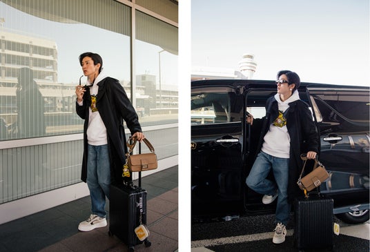 創業100周年を記念し、2025年春夏 メンズ コレクションにおいて日本のキャラクターアーティスト、タロアウト(Tarout)とコラボレーションしたコレクション 「シルヴィア・アンド・ザ・バゲット(Silvia and the Baguette)」のイラストが描かれたフーディに日本限定発売のブラックのトレンチコートを合わせ、足元には「フェンディ フォース(Fendi Force)」スニーカーを履いたフェンディのトータルルックで登場。「シルヴィア・アンド・ザ・バゲット」のチャーム、「セレリア(Selleria)」のネクタイ型チャームを付けた、遊び心のある「バゲット(Baguette)」バッグを身に着け、スーツケースにはトースト型のチャームを飾り、抜け感のある、さわやかなスタイルを完成させました。