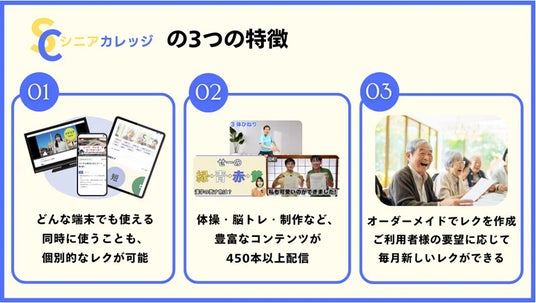 以上のような特徴から、シニアカレッジは全国の介護事業所に向けて、利用者が楽しめ、職員も簡単にできるエンターテイメントを提供し、人手不足の解消や、事業所改善に貢献していきます。
