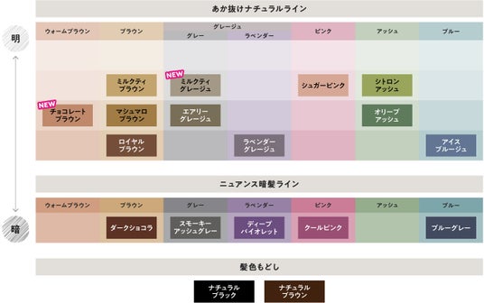今回リニューアルした「泡カラー」は、“あか抜けナチュラルライン”に、新色として「チョコレートブラウン」「ミルクティグレージュ」が加わりました。赤みやオレンジが出やすい元が黒い髪でも、柔らかい透明感あるカラーに仕上がります。また、髪を染めるだけでなく、染めた後も髪のなめらかさや手触りを楽しんでほしいという想いから、アフタートリートメントを従来の8gから15gへ約1.8倍増量。トリートメントは髪内部と外部のダメージをWアプローチで補修し、カラー後の髪もしっとりまとまります。パッケージは、Z世代に人気のアクティビティーである、おしゃれピクニックをモチーフに、自由に楽しく過ごす日常の素敵な時間を表現したデザインに刷新します。