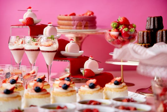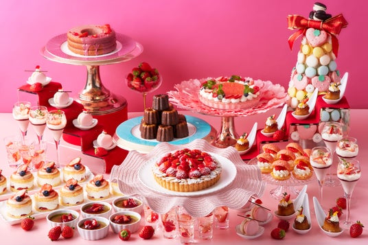 いちごが贅沢にのったシェフ一推しの「ストロベリータルト」、華やかに仕立てたグラスデザート「いちごのヴェリーヌ」、定番の「いちごショートケーキ」、「いちごマカロン」、「いちごティラミス」など、いちごを心ゆくまで味わえるスイーツをブッフェスタイルでご用意します。また、お客様の目の前で仕上げをする「いちごモンブラン」などのシェフサービスをはじめ、スイーツの合い間に嬉しいセイボリーや、いちごスムージーなどのお飲み物各種も揃えております。