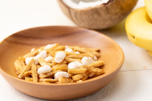 - まろやかな甘さのココナッツとやさしい甘さのバナナチップを組み合わせたヘルシーなお菓子