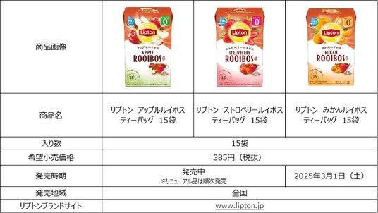 紅茶ブランド「リプトン」は、ルイボスティーシリーズの楽しみ方がさらに広がる、水出し抽出可能な仕様にリニューアル。人気の「リプトン アップルルイボス ティーバッグ 15袋」「リプトン ストロベリールイボス ティーバッグ 15袋」に新フレーバーとして「リプトン みかんルイボス ティーバッグ 15袋」が加わり、2025年3月1日(土)より全国のスーパーマーケット等の量販店、一般小売店等で発売いたします。