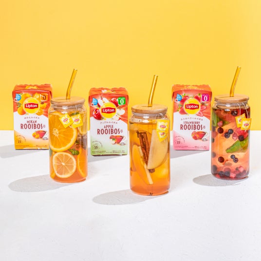 水出しでもおいしく味わっていただける「リプトン ルイボスティー」シリーズは、フルーツやハーブ、スパイスと一緒に水出しするアレンジも自由自在。例えば新商品の「みかん ルイボス」には、ティーバッグとオレンジやレモンなどの柑橘系フルーツとミントを入れるだけで、簡単に身体にもうれしいルイボスティーアレンジがお楽しみいただけます。冷蔵庫に入れておくだけで抽出できるヘルシーなレシピを、自分好みのアイデアでアレンジして、心躍るひとときをお楽しみください。