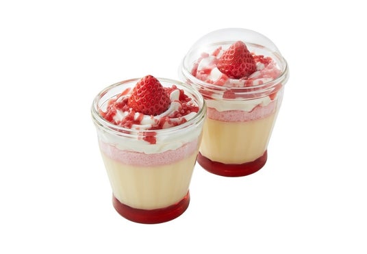 モロゾフ人気の「プリン」と「ストロベリーショートケーキ」の味わいを組み合わせ、“ストロベリーショートケーキ”を彷彿とさせる味わいに。いちご味のスポンジケーキにクリームシャンティを絞り、