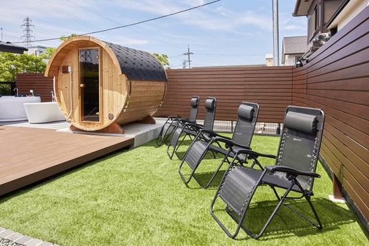 広々としたプライベートガーデンにはバレルサウナ、ジャグジーや水風呂、BBQスペースに焚き火台を完備し、大人数でも同時に楽しめる空間となっています。