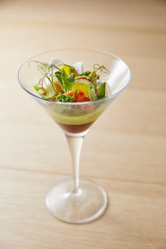 メニュー紹介〈一例〉和歌山県産アシアカエビと紀和味アワビのカクテル 春野菜のクリーム ¥3,200