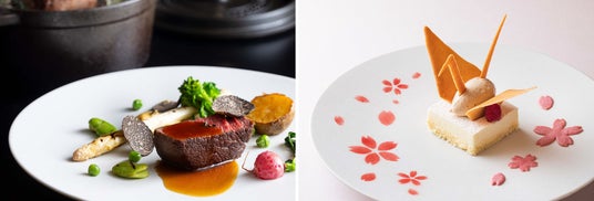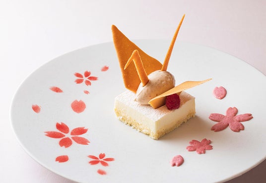 また、デザートで登場するのが、折り鶴をモチーフに“和”を演出した「SAKURAスイーツ」。苺味のクッキーとカカオパウダーで描かれた華やかな桜の花びらが、白いプレートに彩りを添えます。滑らかなレアチーズケーキと、風味豊かな桜アイスクリームのコラボレーションをお楽しみください。