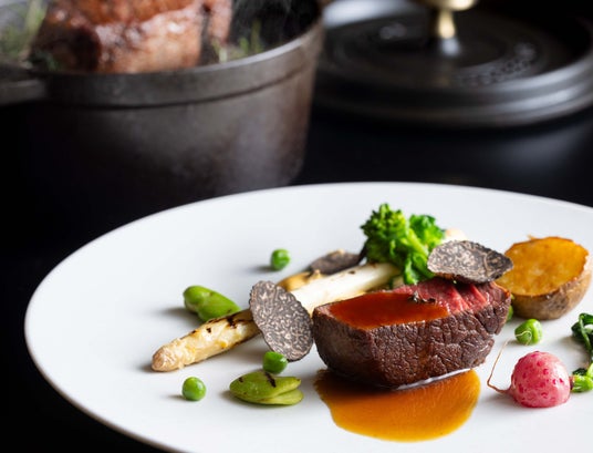 前菜からデザートまでを、お好みでお選びいただけるスタイルが人気の「プリフィックスコース」。その肉料理のオプションメニューで登場する「黒毛和牛フィレ肉とホワイトアスパラガスのグリル 春野菜とトリュフを添えて」は、香ばしく焼き上げた牛フィレ肉を、黒胡椒がピリッときいたガーリック醤油ベースのソースで味わう逸品。ホワイトアスパラガスや青豆、仕上げに纏った華やかなトリュフの香りとともに、お召し上がりください。