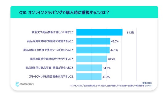 ・説明文や商品情報が詳しく正確なこと:61.3% ・商品写真が鮮明で細部まで確認できること:45.0% ・商品の様々な角度や使用シーンが見られること:44.1% ・商品の質感や素材感が分かりやすいこと:40.5% ・実店舗と同じ商品写真・情報が見られること:34.2% ・スマートフォンでも商品画像が見やすいこと:33.3% ・その他:0.9%