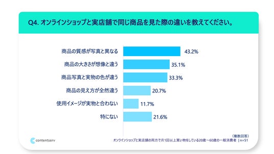・商品の質感が写真と異なる:43.2% ・商品の大きさが想像と違う:35.1% ・商品写真と実物の色が違う:33.3% ・商品の見え方が全然違う:20.7% ・使用イメージが実物と合わない:11.7%