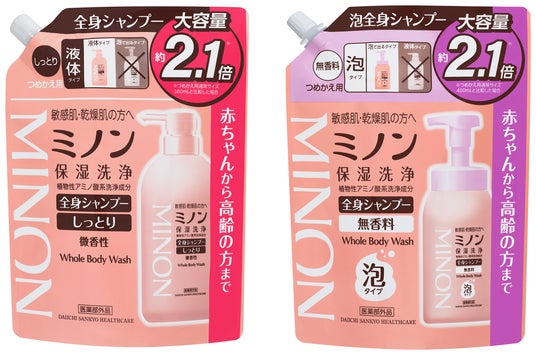 第一三共ヘルスケア株式会社(本社:東京都中央区、社長:内田高広、以下「当社」)は、敏感肌向けブランド「ミノン」から、赤ちゃんから高齢の方までお使いいただける全身洗浄料「ミノン全身シャンプーしっとりタイプ」「ミノン全身シャンプー泡タイプ」(いずれも医薬部外品)のつめかえ用大容量を本年4月14日(月)に追加発売します。