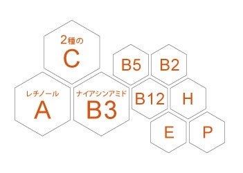 優れた美肌効果を持つ有用成分ビタミンABC(レチノール、 ナイアシンアミド、ビタミンC )など10種のビタミン*をカクテル配合。それぞれの効果を補い還元することで、相乗効果を発揮します。
