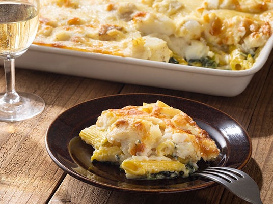 ハーブを効かせたカラスガレイをサフラン風味のペンネとほうれん草でグラタンに仕立てました。