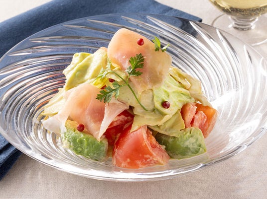 炒めたにんじんとすりおろし玉ねぎのドレッシングで、シャキシャキのキャベツ、アボカド、生ハム、トマトを和えたサラダです。