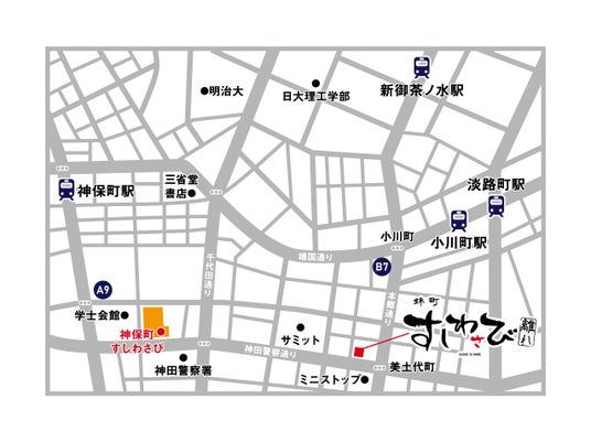 姉妹店である「神保町すしわさび」からは徒歩約5分。