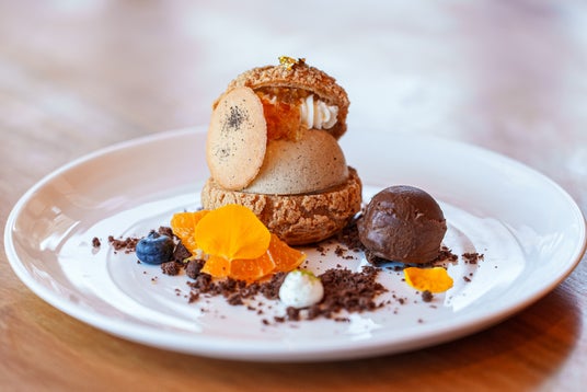 足柄茶の香りを楽しむ一皿足柄茶を焙煎した香り高いほうじ茶を使用した優しい甘さのムースを、クリスピーな食感が魅力のサブレ生地のシューに挟みました。ムースに添えられているのは、小田原産柑橘のマーマレード。皮まで余すところなく丁寧に煮詰めた、甘み、酸味、苦みのバランスが抜群のマーマレードは、ほうじ茶の優しい甘さと素晴らしいコンビネーションを描きます。軽やかなチュイールと濃厚なチョコレートのアイスクリームを添えて。