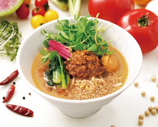 オリジナルのべジとんこつスープは、プラントベースで仕上げたとは思えない驚きのおいしさです。またトッピングしているミネラルやビタミンが豊富なスーパーフードといわれるビーツのパウダーで少しずつスープの色の変化もお楽しみいただけます。