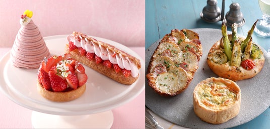 スイーツ 画像左:苺のモンブラン 手前:苺のタルト 右:苺のエクレール パン 画像左:新じゃがとソーセージのフィユテ~パイ仕立て~ 手前:桜海老とタケノコのキッシュ 右:ハーブ香る季節野菜フォカッチャ
