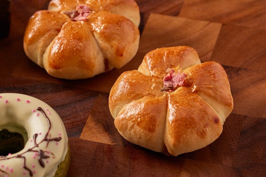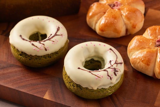 抹茶味のドーナツに桜柄をあしらい、春の装いに。