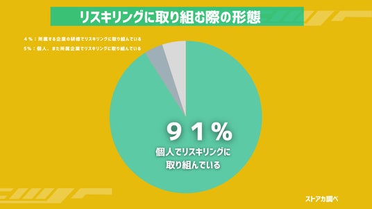 - 学びの形態:「個人でリスキリングに取り組んでいる」が全体の約91%で最多。