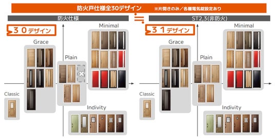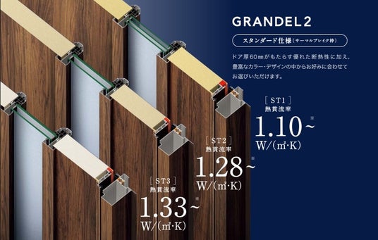 非防火スタンダード仕様「ST2およびST3」(31種類)と同等の30種類を展開し、防火戸においても豊富な選択肢の中からお客さまに国内最高クラスの断熱性能を誇る「グランデル2」をお選びいただくことが可能になります。