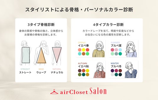 株式会社エアークローゼット(本社:東京都港区、代表取締役社長 兼 CEO:天沼 聰)は、骨格・カラー診断サロン『airCloset Salon(エアクロサロン)』の展開を開始します。本サロンでは、スタイリストが対面で診断を行い、診断結果をもとに最適なコーディネートのご提案を行います。2024年秋に2ヶ月間限定で出店し、好評を得たことを受け、このたび本格展開を決定しました。2025年の第一弾は、有楽町マルイ・新宿マルイ 本館にてスタートします。