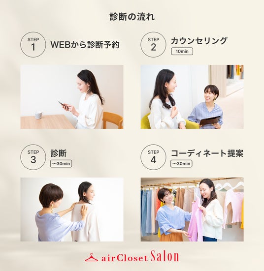 この結果を受けて、新たに骨格・カラー診断サロン『airCloset Salon』をオープンします。本サロンでは、「骨格・パーソナルカラー診断」「パーソナルカラー診断」「骨格診断」「お悩み相談(再訪用)」の4つのメニューをご用意しています。最大の特徴は、スタイリストによる診断後、コーディネート提案をセットでご提供する点です。診断結果を日常のファッションにどう取り入れるかについて、スタイリストが具体的にアドバイスを行うことで、従来のファッション系診断において多くのお客様が感じていた「結果の活用方法がわからない」という悩みを解消します。さらに、その場でお洋服の購入も可能となるため、タイパの良いショッピングもお楽しみいただけます。