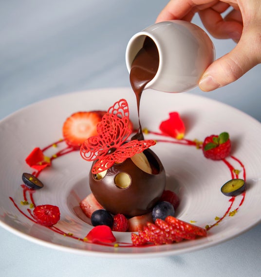 新デザートは、ドーム型のチョコレートの中に、いちごとバニラアイスクリーム、食感も楽しめるよう砕いたチョコレートサブレなどを閉じ込めました。いちごは農家から直送した新鮮な「さちのか」を使用。真っ赤なソースをアクセントにしたお皿に、いちごやラズベリーを飾り、ドーム状のチョコレートには薄く焼いたクッキーの蝶を添え、シェフこだわりの華やかな一皿に仕上げています。お好みで別添えのホットチョコレートソースをかけて、冷たいアイスクリームとのハーモニーをお楽しみいただけます。ホワイトデーのスイーツにもおすすめです。