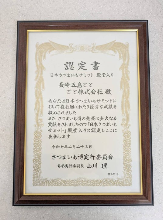 長崎・五島列島産の旬な食材を使用した加工食品の製造販売、五島列島の特産品販売を行う、ごと株式会社(所在地:長崎県五島市/代表取締役社長:木下 秀鷹)は、島内にある自社の畑と契約農家のみで栽培されるブランドさつまいも「ごと芋」が、さつまいも博実行委員会(代表:若林 勇介)が実施するサツマイモの博覧会「さつまいも博2025」内で行われる、品評会「日本さつまいもサミット2024-25」にて、大会史上初となる殿堂入りを果たしました。